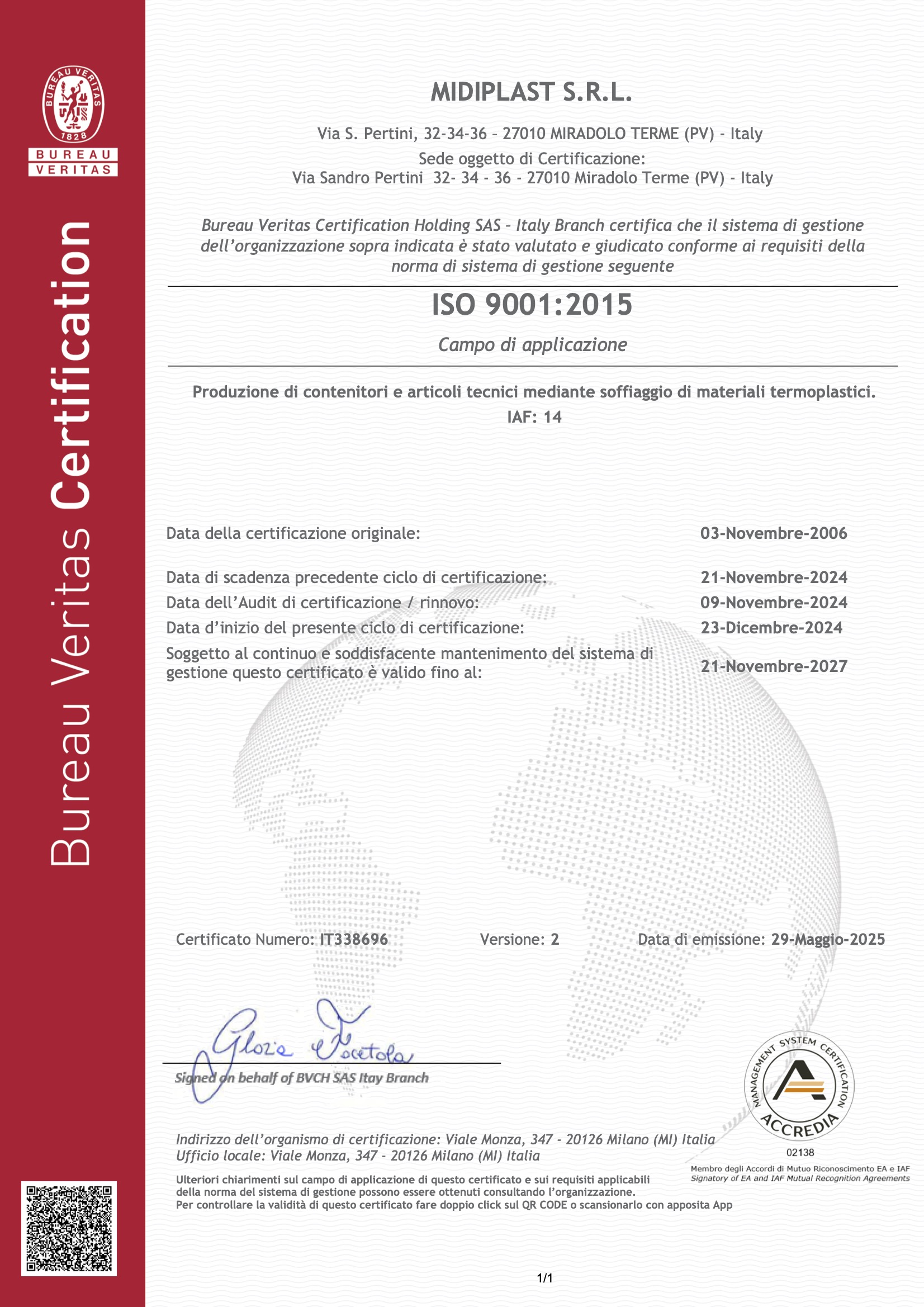Midiplast opera in un "Sistema di Gestione Qualità Certificato".